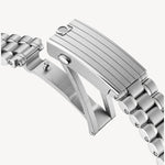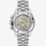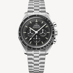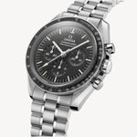 Montat pe o brățară finisată prin lustruire și periere, cu cinci arcade pe rând, acest ceas Moonwatch de 42 mm din oțel inoxidabil are cristal de safir pe față și pe spate. Inspirat de designul celei de-a 4-a generații Speedmaster purtat pe Lună, dispune de o carcasă asimetrică, cadran negru în trepte cu sigla OMEGA aplicată și faimosul punct deasupra cifrei 90 de pe inelul de lunetă din aluminiu anodizat.