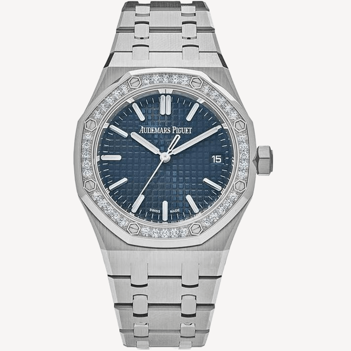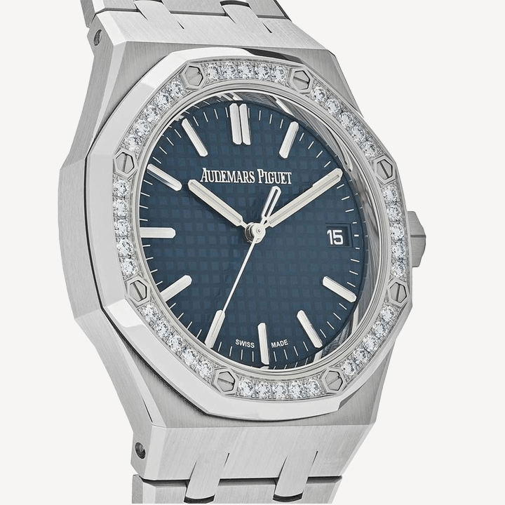 Un simbol al eleganței contemporane, acest model Royal Oak de 37 mm îmbină armonios sportivitatea sofisticată cu detalii luxoase. Carcasa din oțel inoxidabil este accentuată de un bezel încrustat cu diamante tăiate briliant, oferind o strălucire subtilă designului octogonal emblematic.