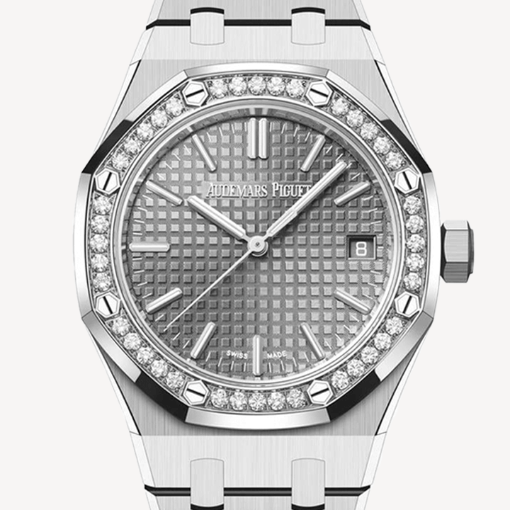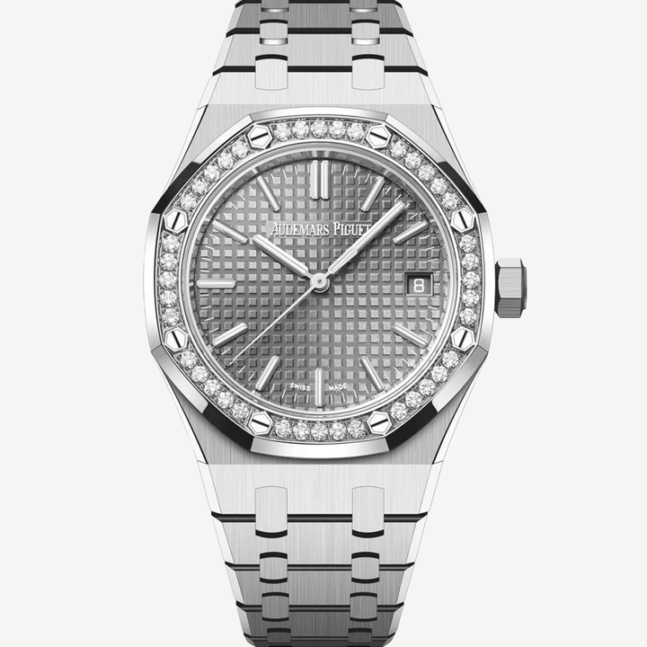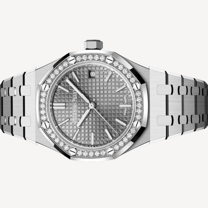 Creat pentru a celebra 50 de ani de excelență orologeră, acest model Royal Oak de 37 mm îmbină designul emblematic al colecției cu detalii contemporane rafinate. Carcasa din oțel inoxidabil este pusă în valoare de un bezel încrustat cu diamante tăiate briliant, oferind o notă de eleganță discretă.