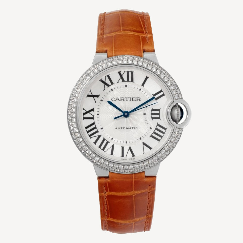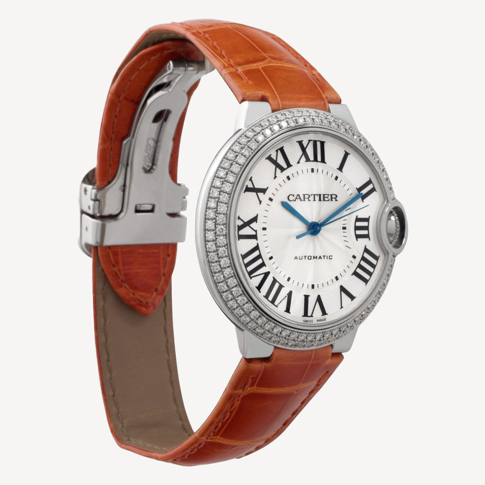 Ceasul Cartier Ballon Bleu, realizat din aur alb de 18 carate, se remarcă prin bezelul său original decorat cu diamante dispuse pe două rânduri. Acesta este montat pe o curea din piele de crocodil, cu o cataramă din aur alb de 18 carate, specifică brandului Cartier. Dispune de un mecanism automat și are o dimensiune a carcasei de 36 mm.