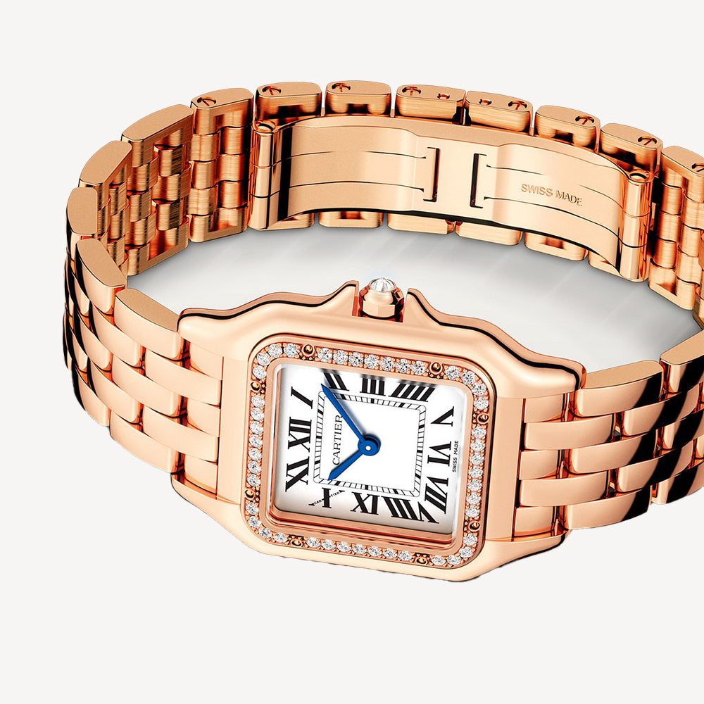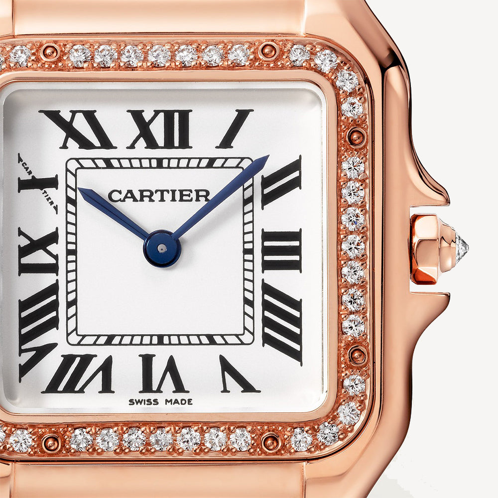Cadranul argintiu cu finisaj satinat, cu cifre romane negre și ace albastre în formă de sabie, reflectă stilul inconfundabil Cartier. Brățara compusă din zale fine din aur roz oferă o purtare perfectă, asemenea unei bijuterii luxuriante, conturând delicat linia mâinii.
