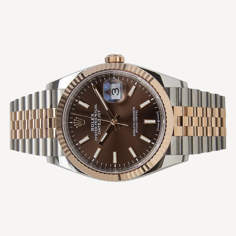 Acest Oyster Perpetual Datejust 36, fabricat din Oțel Inoxidabil și Aur Roz, impresionează cu un cadran în nuanțe de ciocolată și o elegantă brățară Jubilee.
