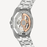 Cu funcții precum afișajul dată și rezerva de putere, acest Royal Oak nu doar măsoară timpul, ci oferă o experiență orologică completă. Brățara integrată și închiderea pliabilă asigură o potrivire perfectă și un confort pe măsură. Un ceas pentru cei care apreciază atât estetica atemporală, cât și performanța excepțională.