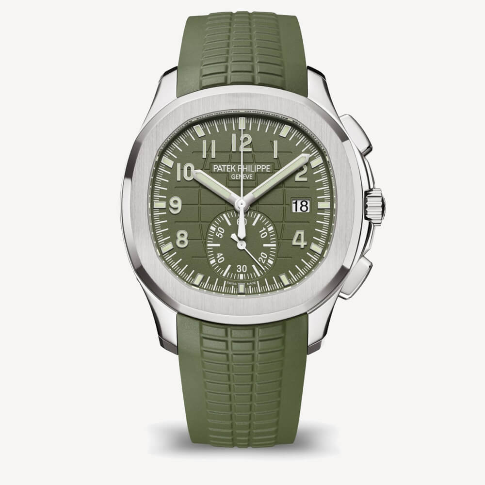 Patek Philippe Aquanaut - 5968G-010 aduce un strop de culoare în lumea ceasurilor de lux cu o curea verde kaki, gravată cu modelul distinctiv Aquanaut. Cu o carcasă de 42.2 mm din aur alb și un spate din cristal de safir, acest ceas oferă o privire înăuntru către inovația și precizia mecanismului său complex.