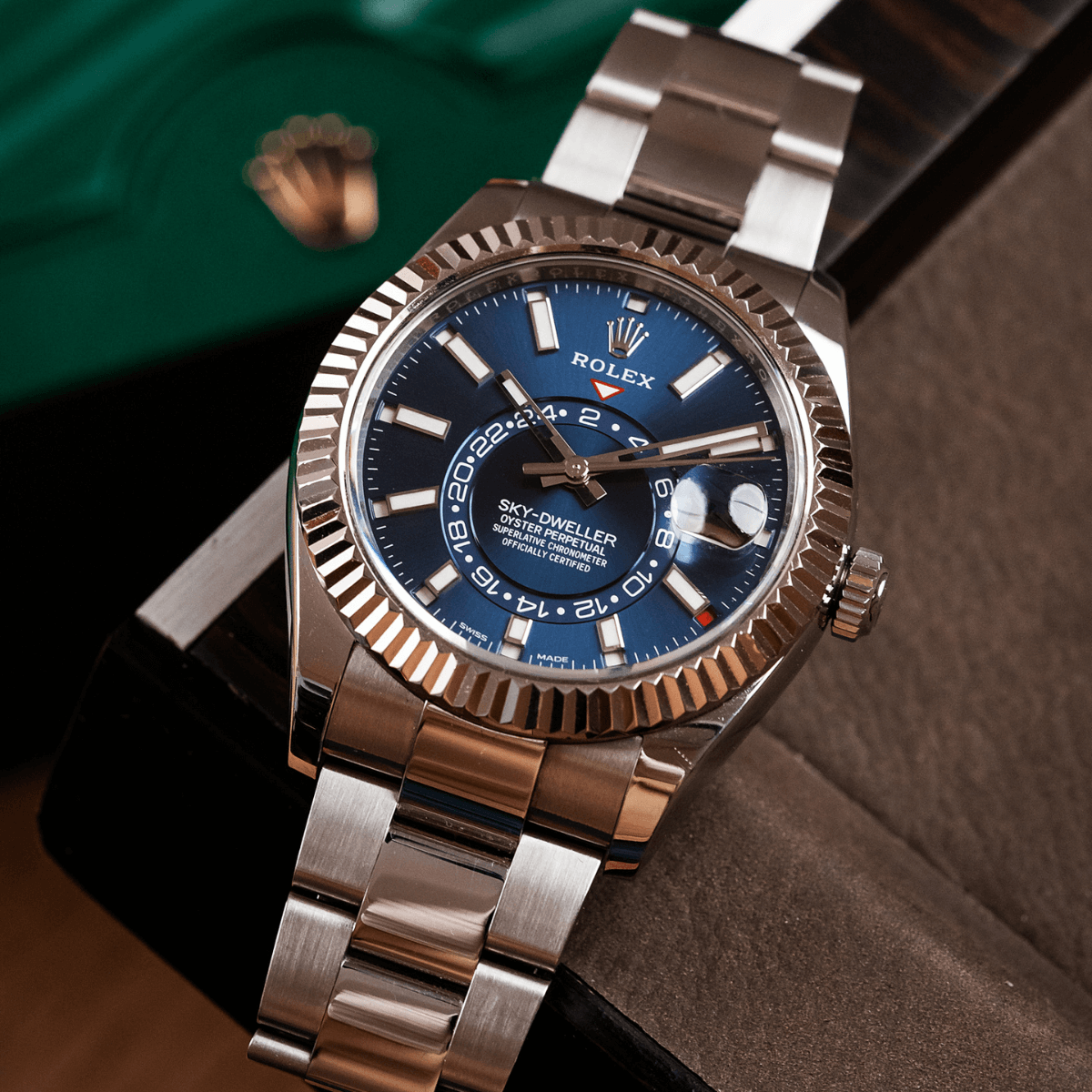 Descoperă colecția Rolex Sky-Dweller de la EraVault. Conceput pentru călători, acest model elvețian afișează simultan două fusuri orare și calendar, combinând funcționalitatea cu precizia mecanică.