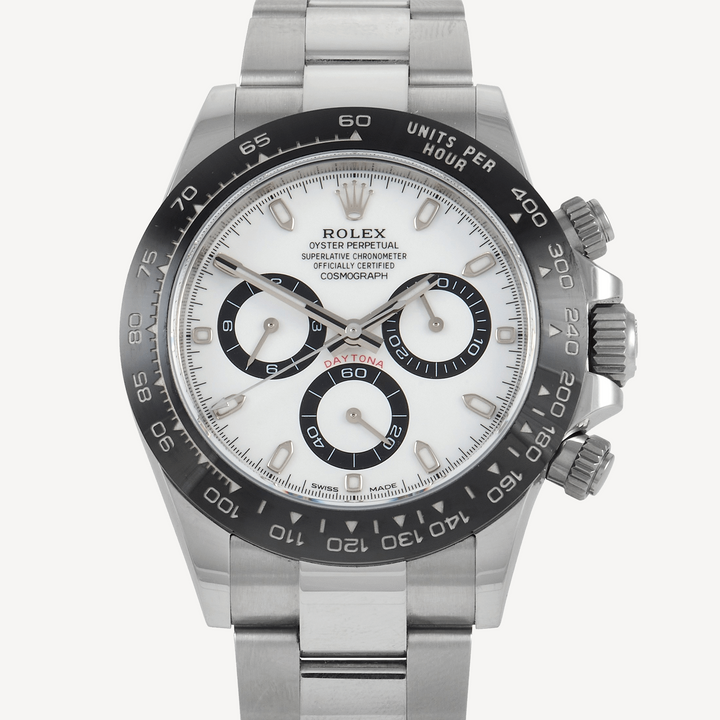 Cronograful din oțel inoxidabil cu diametrul de 37 mm, cu cadranul său alb-deschis revelator, subcadranele negre contrastante și pista de minute, precum și bazel gravată cu scală tahimetrică, a fost un cadou pentru Newman de la soția sa, actrița Joanne Woodward, fundul carcasei sale fiind gravat cu o notă afectuoasă de precauție, "Drive Carefully - Me" (Condu cu grijă - Eu), o referire la începutul carierei de pilot de curse a lui Newman în acea perioadă. Achiziționat în 1968, ceasul a fost păstrat în familia Newman timp de aproape 50 de ani înainte de a fi trimis la licitație. La 17,75 milioane de dolari, modelul rămâne cel mai scump ceas Rolex vândut vreodată.