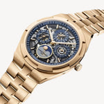 Contemporary by design, yet respectful of watchmaking tradition, this watch in 18K 5N pink gold houses an ultra-thin, entirely skeletonized perpetual calendar. Accurate until the year 2100, a moon phase with a star-studded sky and two gold moons add the finishing touches to the calendar. The fine watchmaking finishes and gray tone of the NAC-coated caliber can be seen both from the front and through the sapphire caseback. The watch can be personalized thanks to its system of three easily interchangeable straps – leather, rubber, and 18K 5N pink gold.