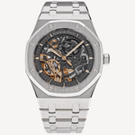 Skeleton dial with rose gold-tone hands and index hour markers. Dial Type: Analog. Luminescent hands and markers. Audemars Piguet Calibre 3132 Automatic movement, based upon Audemars Piguet AP 3120, containing 38 Jewels, bitting at 21600 vph, and has a power reserve of approximately 45 hours. Scratch resistant sapphire crystal. Screw down crown. Skeleton transparent exhibition see through case back. Octagon case shape, case size: 41 mm. Fold over with safety release clasp. Water resistant at 50 meters . Functions: hours, minutes, centre seconds. Luxury watch style.