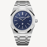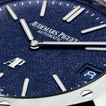 The introduction of a new grainy blue dial offers a new interpretation of the famous Royal Oak “Jumbo” model that is presented here in an extra-thin white gold case. Blue dial with “grainy effect”, white gold applied hour-markers and Royal Oak hands with luminescent coating. 18-carat white gold case, glareproofed sapphire crystal and caseback.