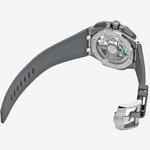 The newly designed 43 mm Royal Oak Offshore, powered by Calibre 4401, takes on grey hues with its titanium case, grey ceramic bezel, refined “Méga Tapisserie” dial and interchangeable rubber strap.