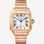 Cartier Santos de Cartier Watch - 39.8 mm Rose Gold Case - Silvered Opaline Dial - Alligator Skin Bracelet 39.8 mm 18K rose gold case, 18K rose gold 7-sided crown set with a faceted sapphire, sapphire crystal, silvered opaline dial, calibre 1847 MC automatic movement, alligator skin bracelet with SmartLink adjustment system, interchangeable 18K rose gold folding buckle. Water resistant to 10 bar (approx 100 metres).