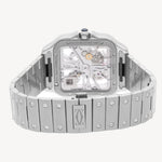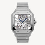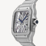 Pre-Owned Cartier Santos de Cartier (WHSA0015) manual wind watch, features a 39.8mm stainless steel case surrounding a skeleton dial on a stainless steel bracelet with folding buckle. Functions include hours and minutes.