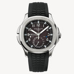 Aquanaut Travel Time. Dual time zone mechanism indicating local and home time. Local and home day/night indications in apertures. Local date by hand. Sweep seconds hand. black embossed dial. Steel. Screw-down crown. Sapphire-crystal case back. Water-resistant to 120m. Case diameter (10-4 o'clock): 40.8 mm. Height: 10.2 mm. Black polymer material. Aquanaut fold-over clasp.