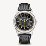 Yellow accents on the minute and hour track, and the central seconds hand, bring a pop of fun color to this watch. The beating heart of this watch is caliber 26-330 S C ticking at 28,800 beats per hour, with 45 hours of power reserve. The watch is worn on a black calfskin strap embossed with a similar carbon motif, with a yellow-colored underside and yellow stitching.