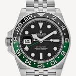 This model features a black dial and a two-colour Cerachrom bezel insert in green and black ceramic. In addition to conventional hour, minute and seconds hands, the GMT-Master II features an arrow-tipped hand, which circles the dial once every 24 hours, as well as a bidirectional rotatable 24-hour graduated bezel.