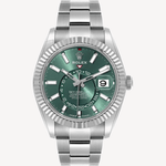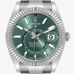 The Oyster Perpetual Sky-Dweller in Oystersteel and white gold with a mint green dial and an Oyster bracelet.