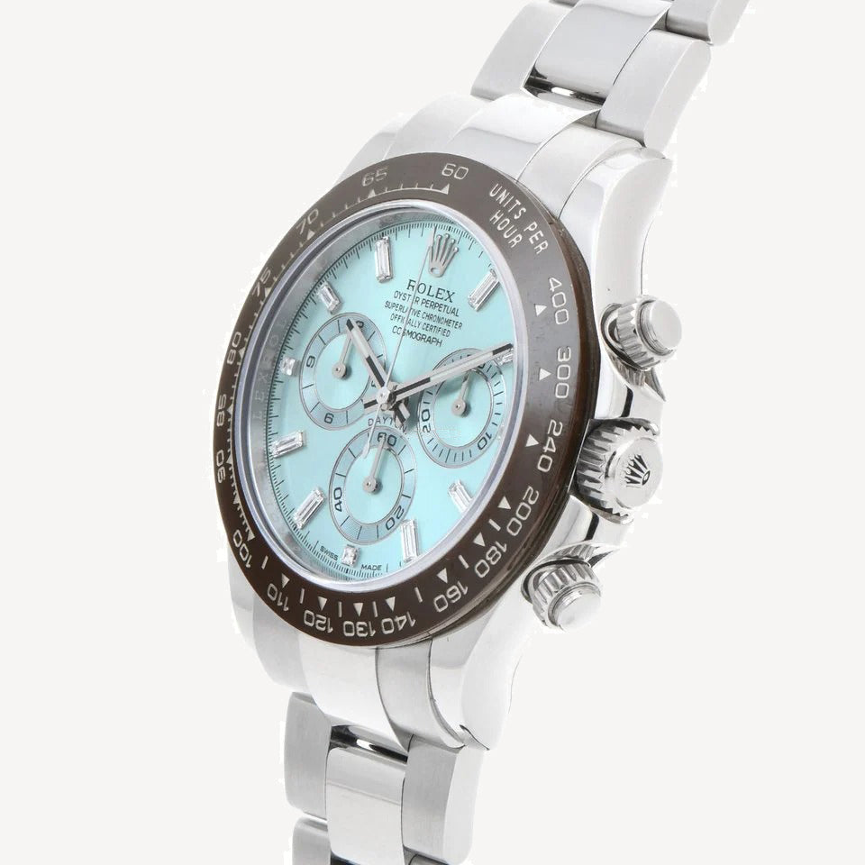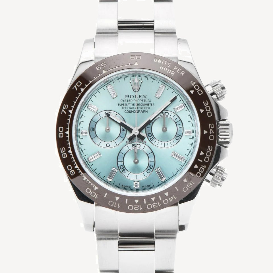 The Rolex Daytona “Ice Blue Baguette Diamond Dial” is an exquisite timepiece that combines high performance with opulent luxury.