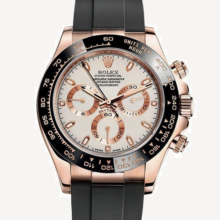 This self-winding movement powers the functions presented on the ivory-toned dial, namely central hours, minutes and chronograph seconds, small seconds, and 30-minute and 12-hour chronograph counters. The movement is safely nested in a 40 mm case that is made of 18K Everose gold. The case is water-resistant to 100 meters and fitted with a black Cerachrom bezel with engraved tachymeter scale. The watch is worn on an Oysterflex strap made of flexible metal blades overmoulded with high-performance elastomer, secured on the wrist with a folding Oysterlock safety clasp.