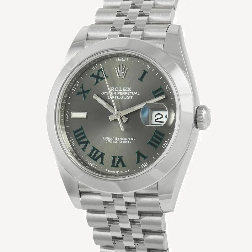 Sleek and stylish, it features a 41mm case, bezel, and bracelet made from shimmering stainless steel. The dark gray dial makes a statement thanks to design elements like luminous silver toned hands, contrast Roman numeral hour markers, and a date dial located at the 3-o-clock position. Powered by an automatic Rolex calibre 3235 movement, it possesses a 70 hour power reserve and a 100 meter water resistance.