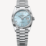 The Oyster Perpetual Day-Date 36 in platinum with an ice-blue dial, fluted bezel and a President bracelet.