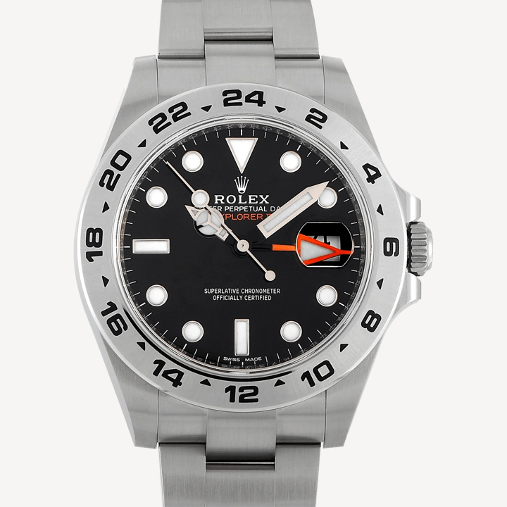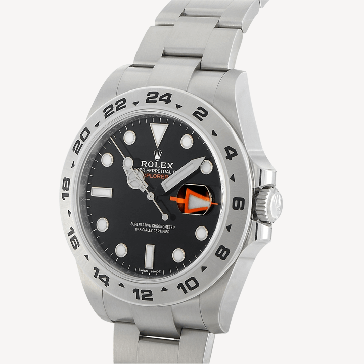 The Rolex Explorer II, reference number 216570, features an Oystersteel bracelet, a solid case back, an Oystersteel bezel, and a black 42mm dial with a Chromalight 24-hour hand and hour markers. Its extremely resistant Oystersteel case, waterproofness, and incredibly legible dial undoubtedly make it a timepiece for the extremes.