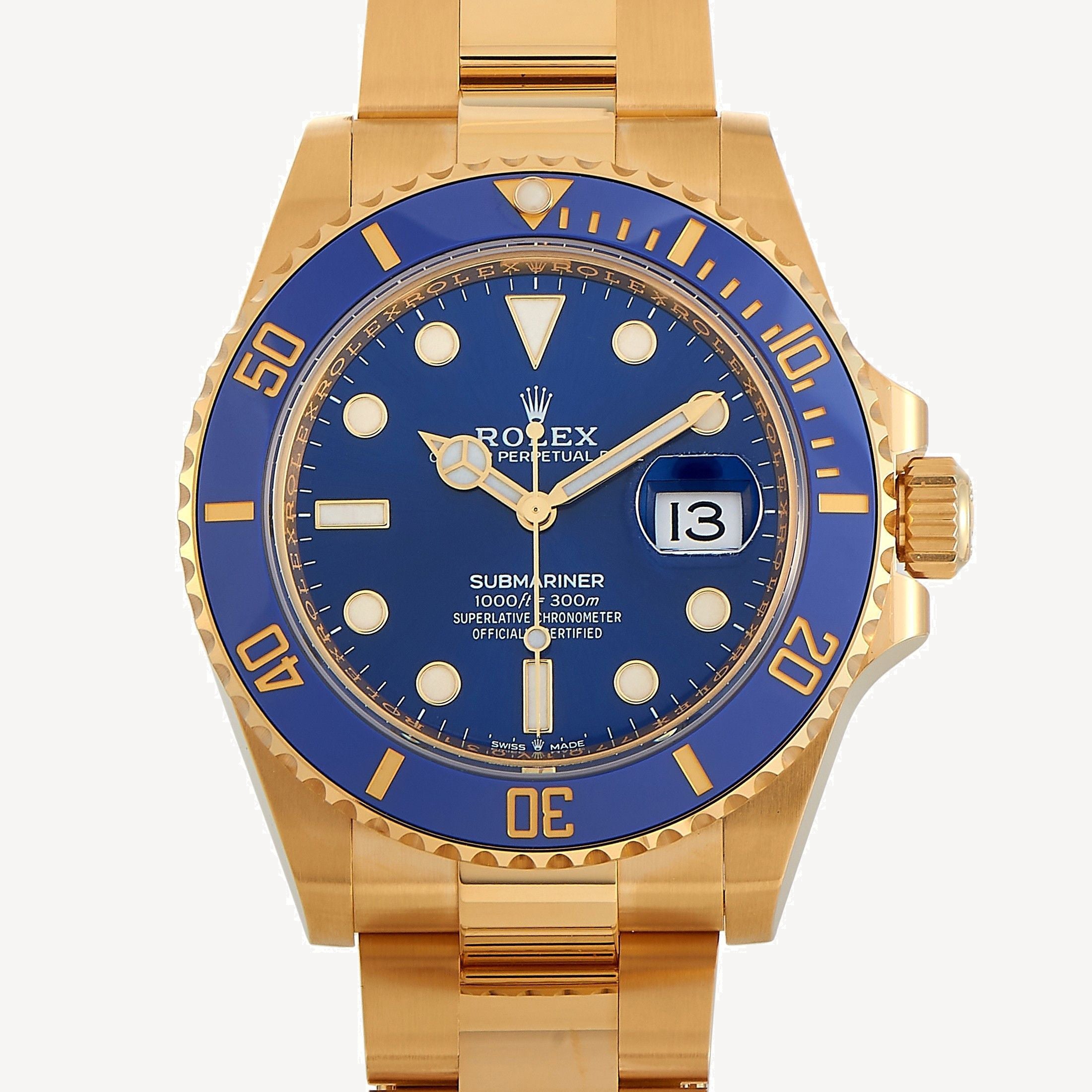 The Oyster Perpetual Submariner Date in 18 ct yellow gold with a Cerachrom bezel insert in blue ceramic and a royal blue dial with large luminescent hour markers.