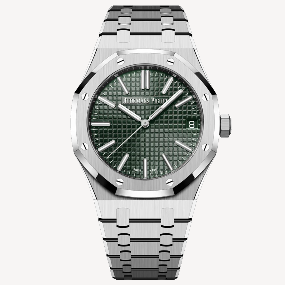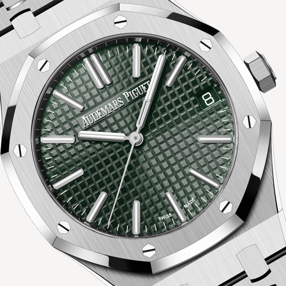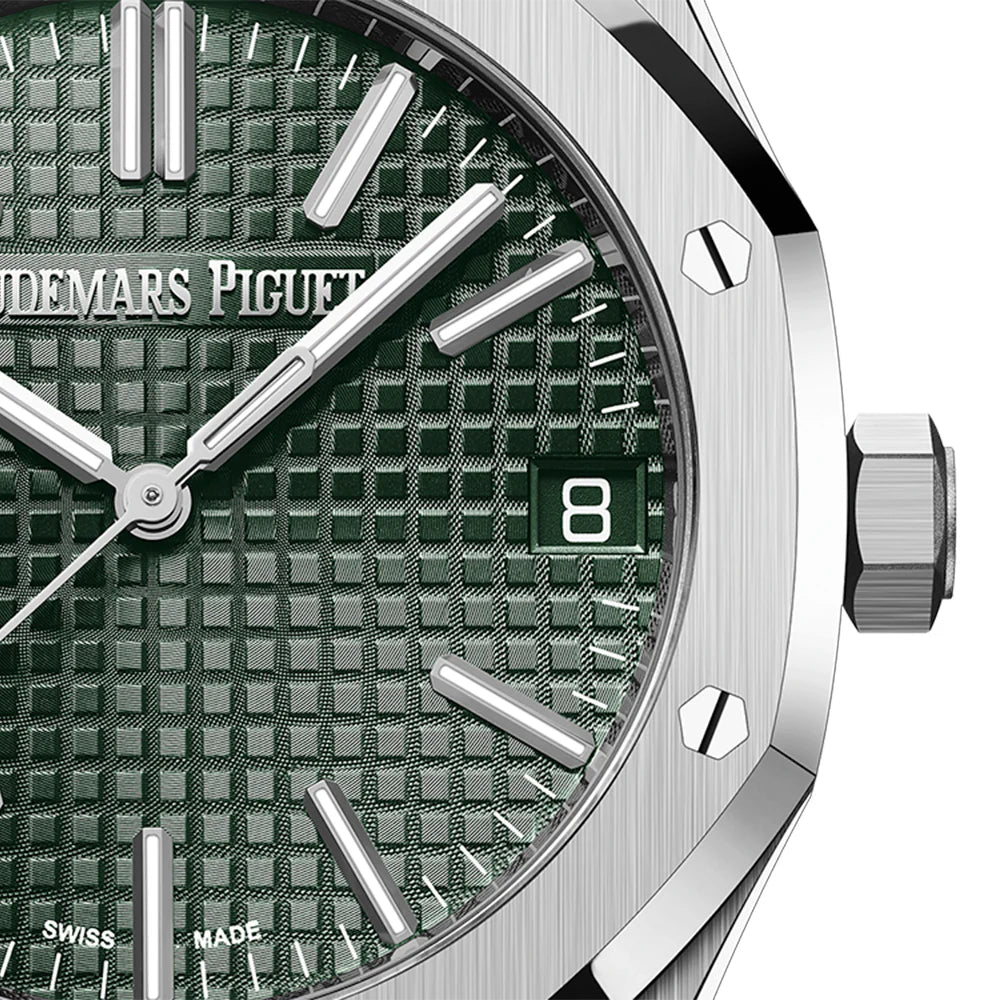 Khaki green dial with “Grande Tapisserie” pattern, white gold applied hour-markers and Royal Oak hands with luminescent coating.