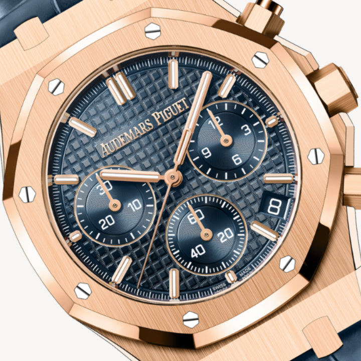 The "Bleu Nuit, Nuage 50" “Grande Tapisserie” dial provides an elegant contrast with the 18-carat pink gold case and bracelet. This 41 mm Selfwinding Chronograph also benefits from the latest Royal Oak design evolution. 18-carat rose gold case, glareproofed sapphire crystal and caseback, screw-locked crown. “Bleu nuit nuage 50” dial with “Grande Tapisserie” pattern, “Bleu nuit nuage 50” counters, pink gold applied hour-markers and Royal Oak hands with luminescent coating. 18-carat rose gold bracelet with AP folding clasp.