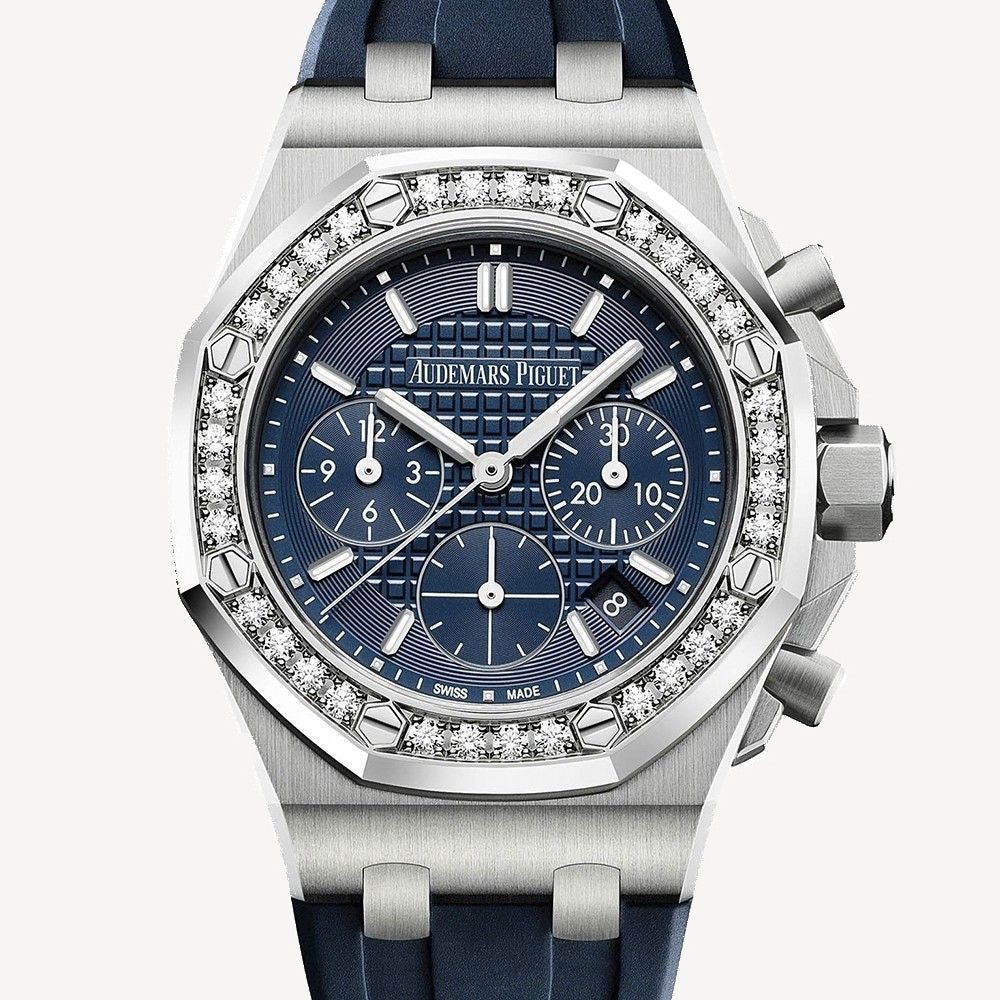 Gorgeous and sharp Audemars Piguet Royal Oak casted in a 37 mm stainless steel case, 12.4 mm thick, glare proof sapphire crystal back, screw-locked crown, diamond-set bezel with 32 brilliant-cut diamonds (~1.02 carats), glare proof sapphire crystal, blue dial with Lady Tapisserie pattern, blue counters, blue external zone, white gold applied hour-markers and Royal Oak hands with luminescent coating, Calibre 2385 self winding movement with chronograph, hours, minutes, small seconds and date, approximately 40 hours of power reserve, blue rubber strap, stainless steel AP folding buckle. Water resistant to 50 meters.