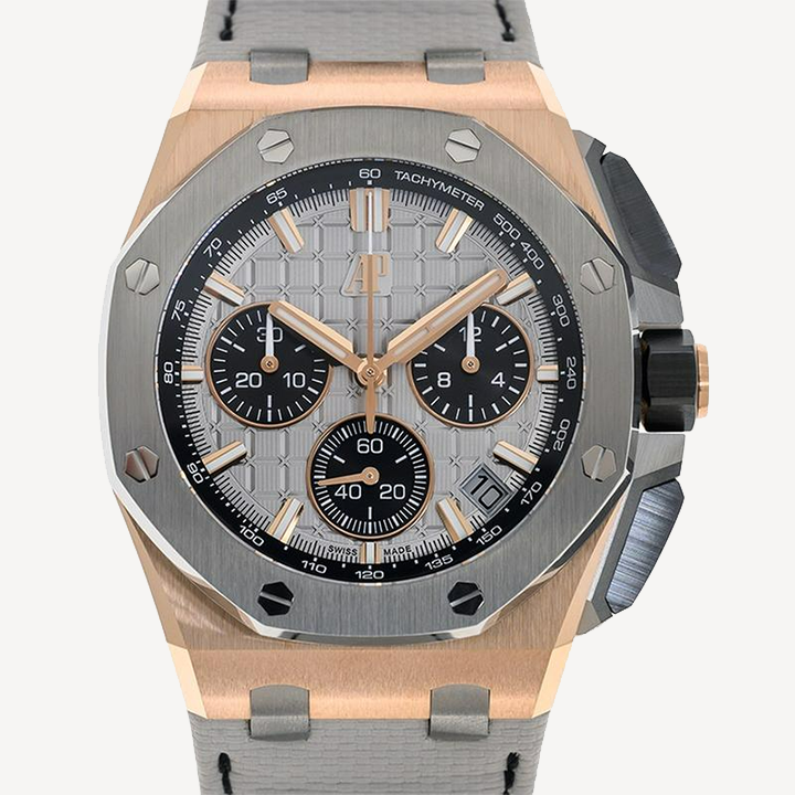 Grey dial with “Méga Tapisserie” pattern, black counters and external zone, pink gold applied hour-markers and Royal Oak hands with luminescent coating, black inner bezel.