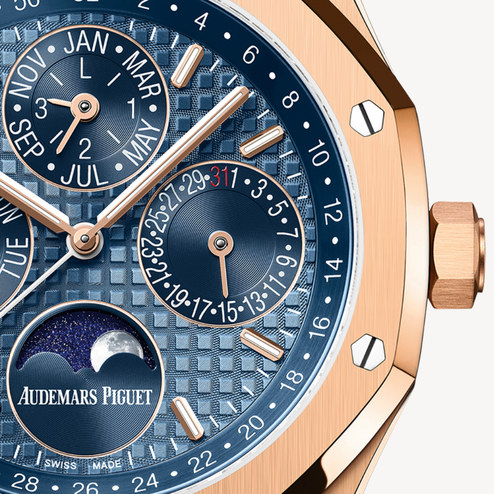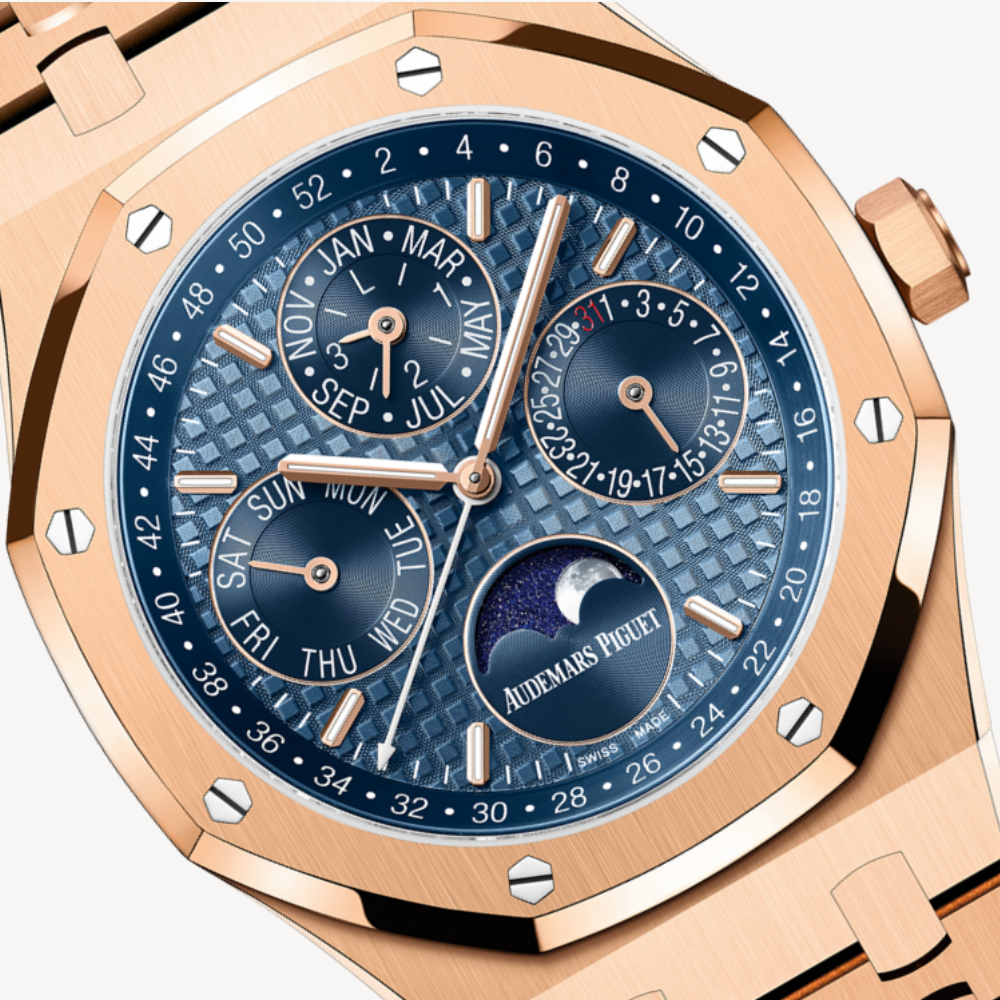 The blue shades of the Royal Oak Perpetual Calendar’s dial provide a powerful contrast with the 18-carat pink gold case and bracelet. The subdials and inner bezel adorn the iconic “Night Blue, Cloud 50” hue of the original Royal Oak. 18-carat pink gold case, glareproofed sapphire crystal and caseback.