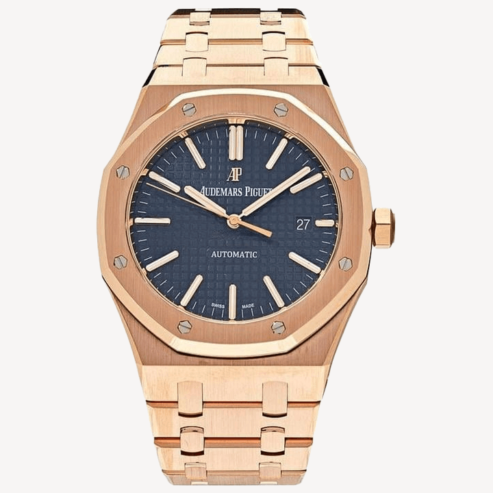 Audemars Piguet Royal Oak 15400OR.OO.1220OR.03 Men's Watch. 41mm 18K rose gold case with 18K rose gold octagon-shaped fixed bezel. Blue grande tapisserie pattern dial with rose gold-tone luminous hands and luminous index hour markers. Date display at 3 o'clock position. 18k rose gold bracelet with fold-over clasp with hidden double push-button safety. Will fit up to a 7-inch wrist. Sapphire crystal. Transparent sapphire crystal case back. Caliber 3120 automatic self-winding movement with a 60-hour power reserve.
