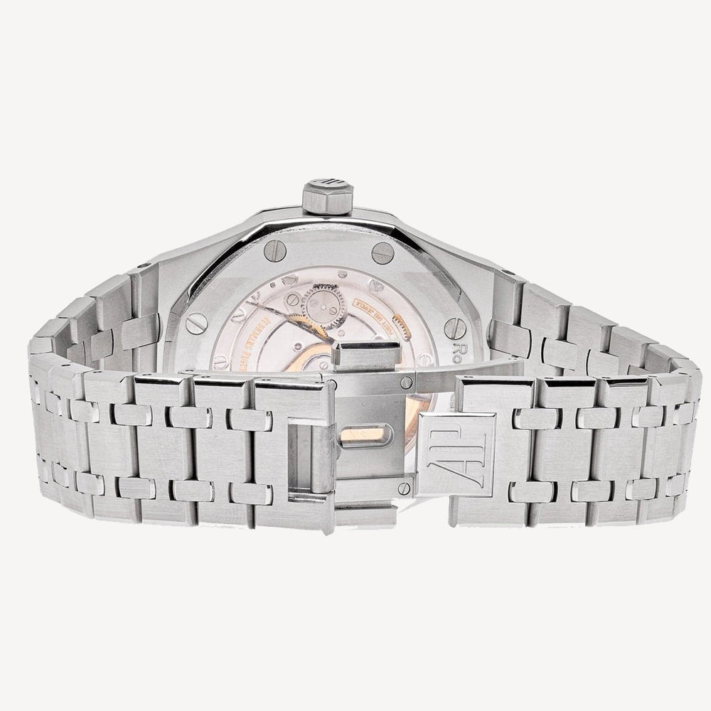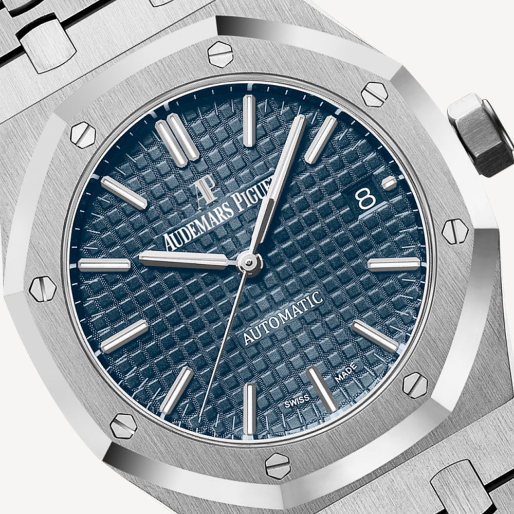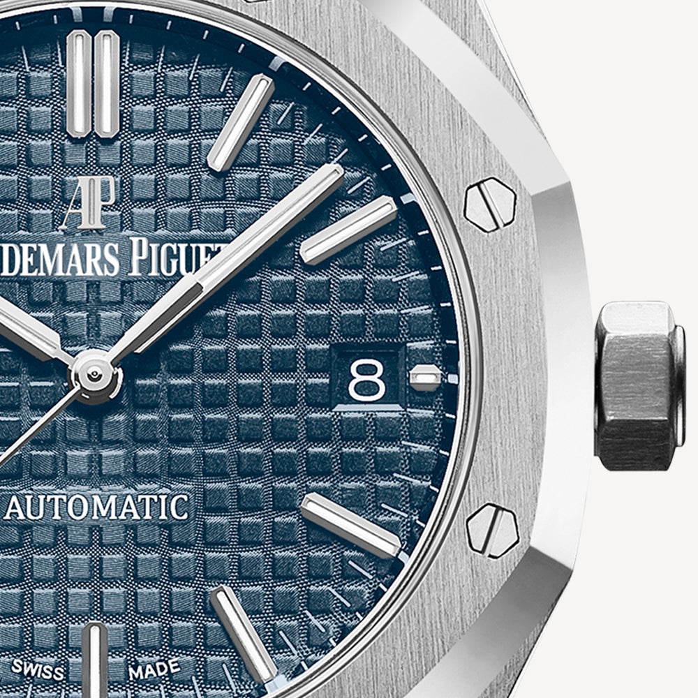 Blue dial with “Grande Tapisserie” pattern, white gold applied hour-markers and Royal Oak hands with luminescent coating.