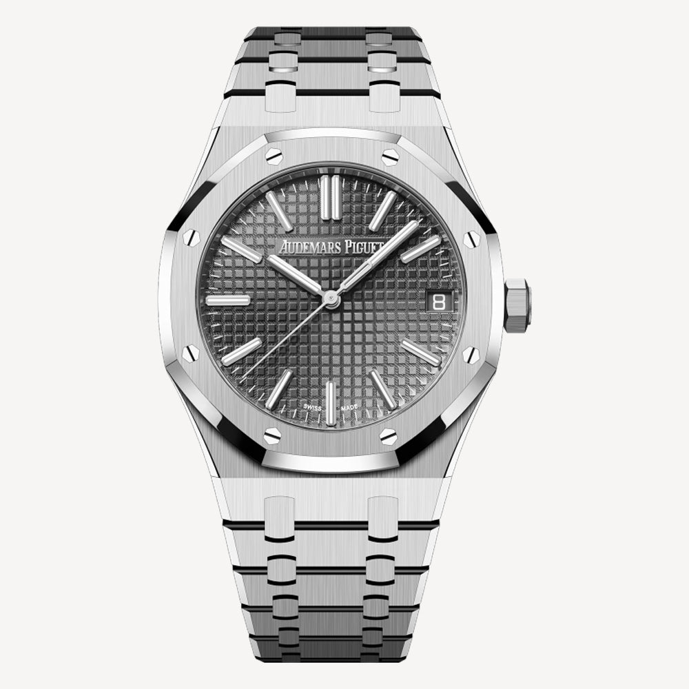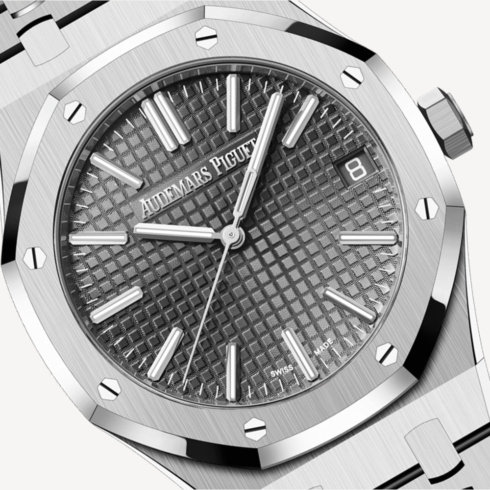 This monochromatic 41 mm Royal Oak Selfwinding, which unites stainless steel with a grey Grande Tapisserie dial, encompasses the collection’s refined and ergonomic design evolution.