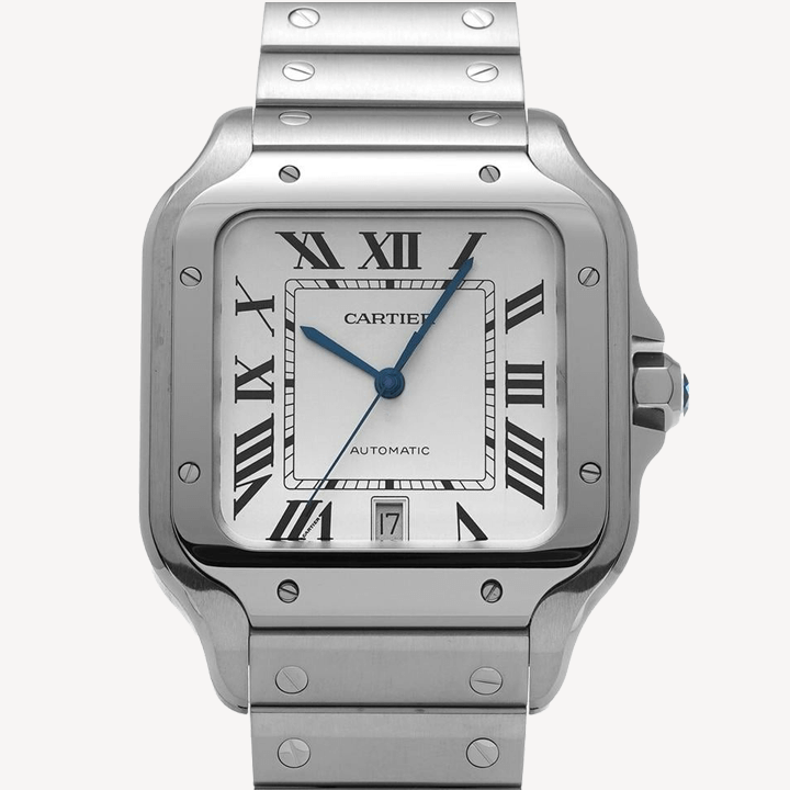 Cartier Santos Silver Dial Large Steel Mens Watch WSSA0018. Automatic self-winding movement. Stainless steel case 39.8 x 47.5 mm. Octagonal crown set with the faceted blue spinel. Stainless steel bezel punctuated with 8 signature screws.