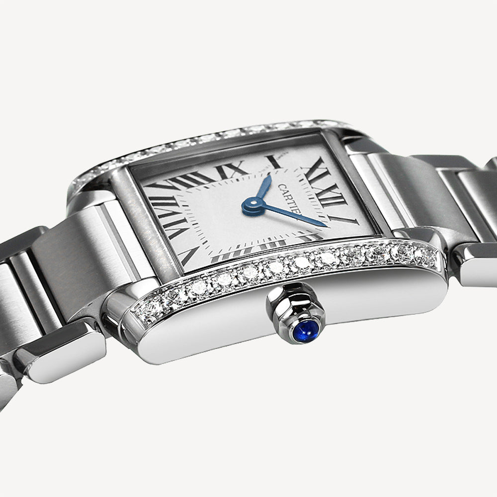 Tank Française watch, medium model, quartz movement. Steel case set with 26 brilliant-cut diamonds totalling 1.09 carats, steel faceted crown with a synthetic blue cabochon-shaped spinel. Silvered sunray dial, blued-steel sword-shaped hands, sapphire crystal. Steel bracelet. Water-resistant up to 3 bar (approx. 30 metres).