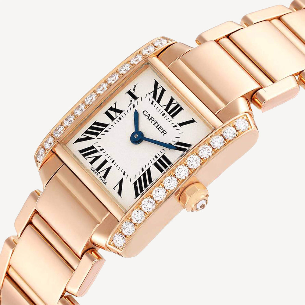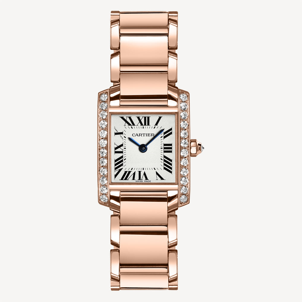 Excellent preowned ladies small Cartier Tank Francaise in 18k rose gold features silver dial with Roman numerals and blue sword-shaped hands. Original diamond bezel (24 brilliant-cut diamonds). Comes on Cartier 18k rose gold bracelet with deployant buckle.