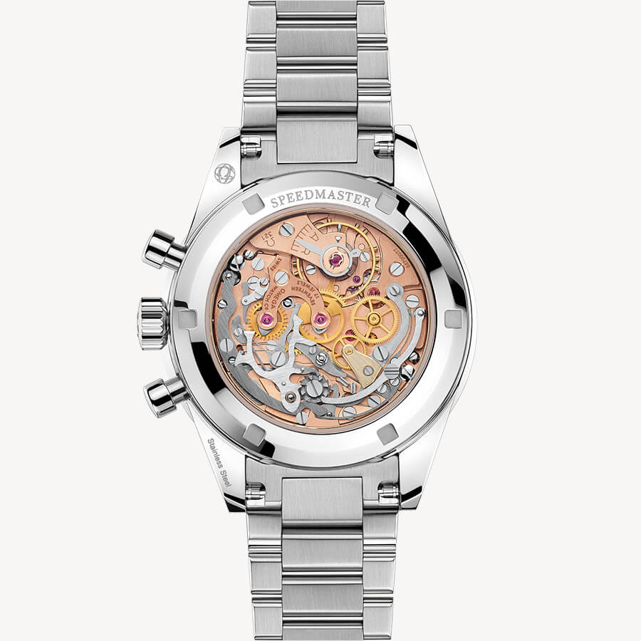 The black step dial features familiar Moonwatch hands, a vintage OMEGA logo, as well as a small seconds sub-dial, 30-minute recorder and 12-hour recorder along with a central chronograph hand. Through the sapphire-crystal caseback, you can see the Calibre 321 inside.