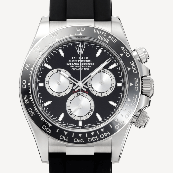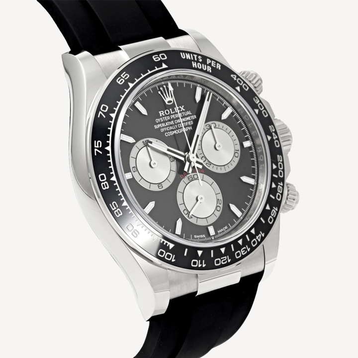 This Oyster Perpetual Cosmograph Daytona in 18 ct white gold, with a steel and bright black dial and an Oysterflex bracelet, features a black Cerachrom bezel with tachymetric scale.