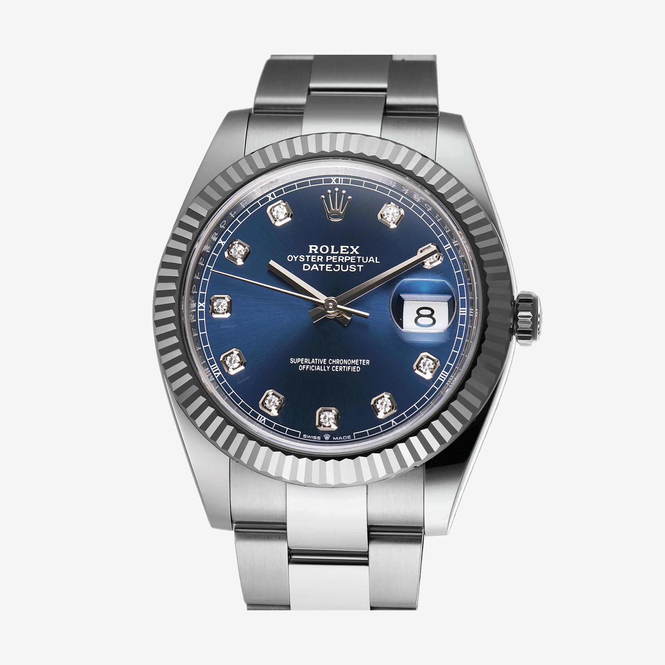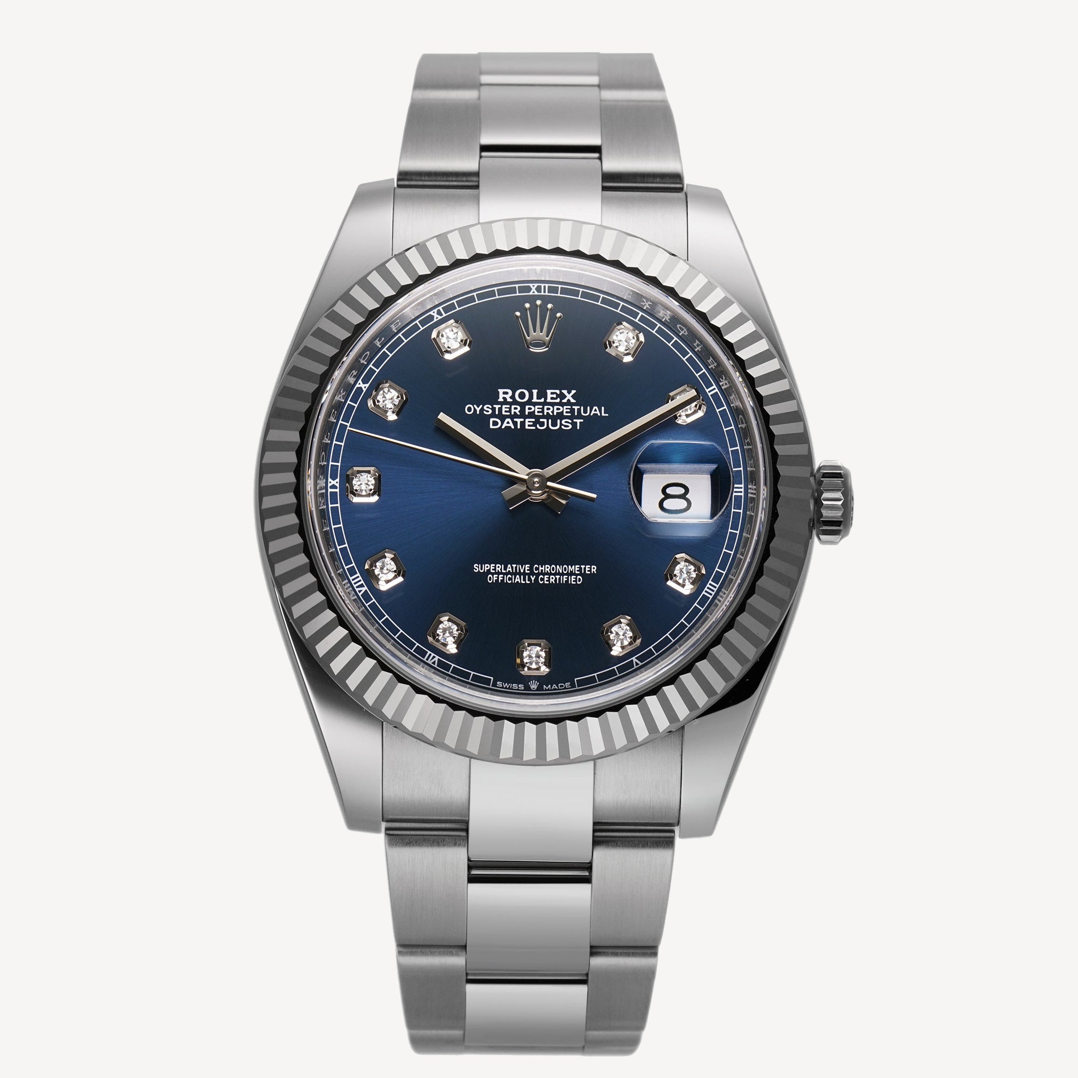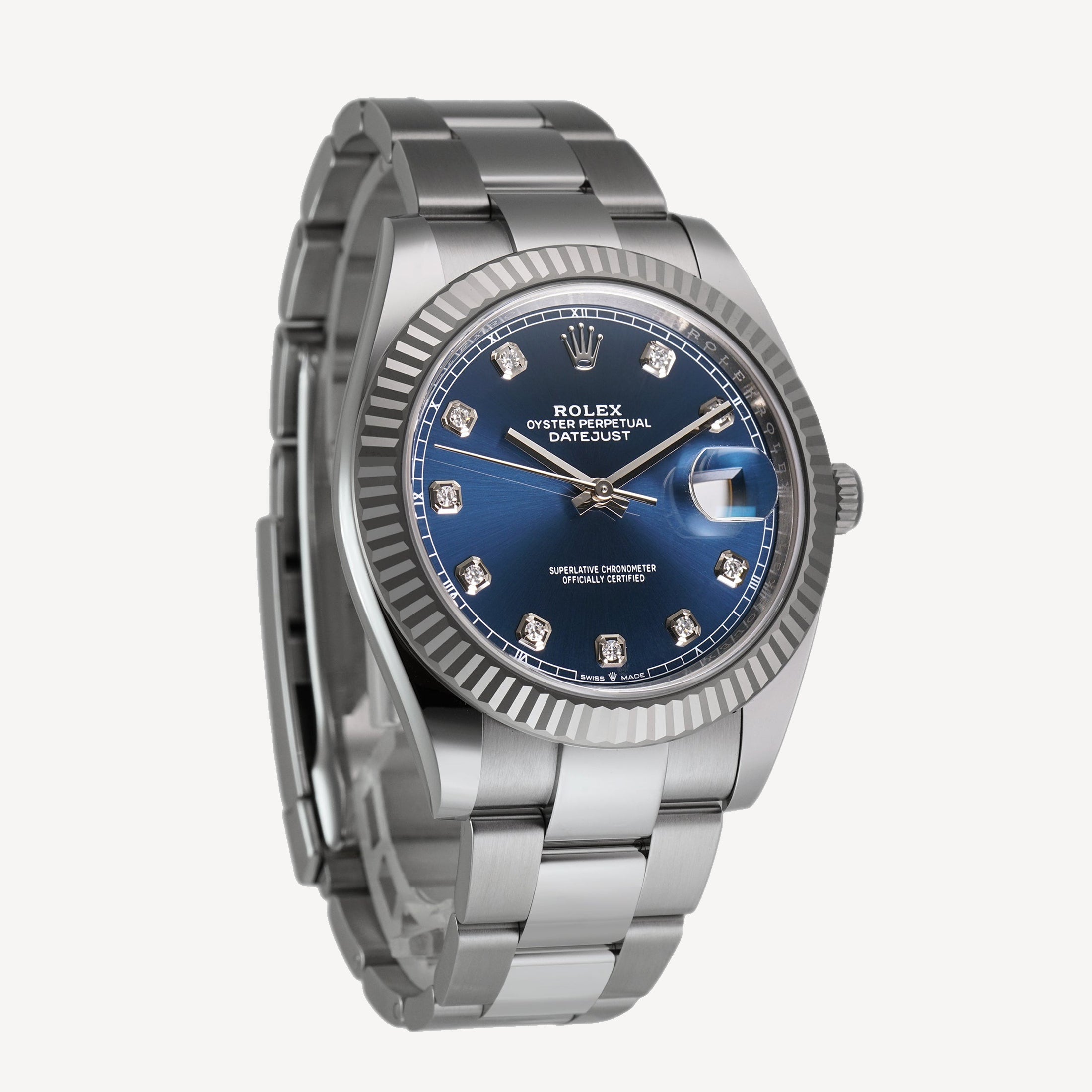 Functions are displayed on a beautiful sunray finished blue dial with white gold hands and diamond hour markers as well as a date at 3 o'clock.
