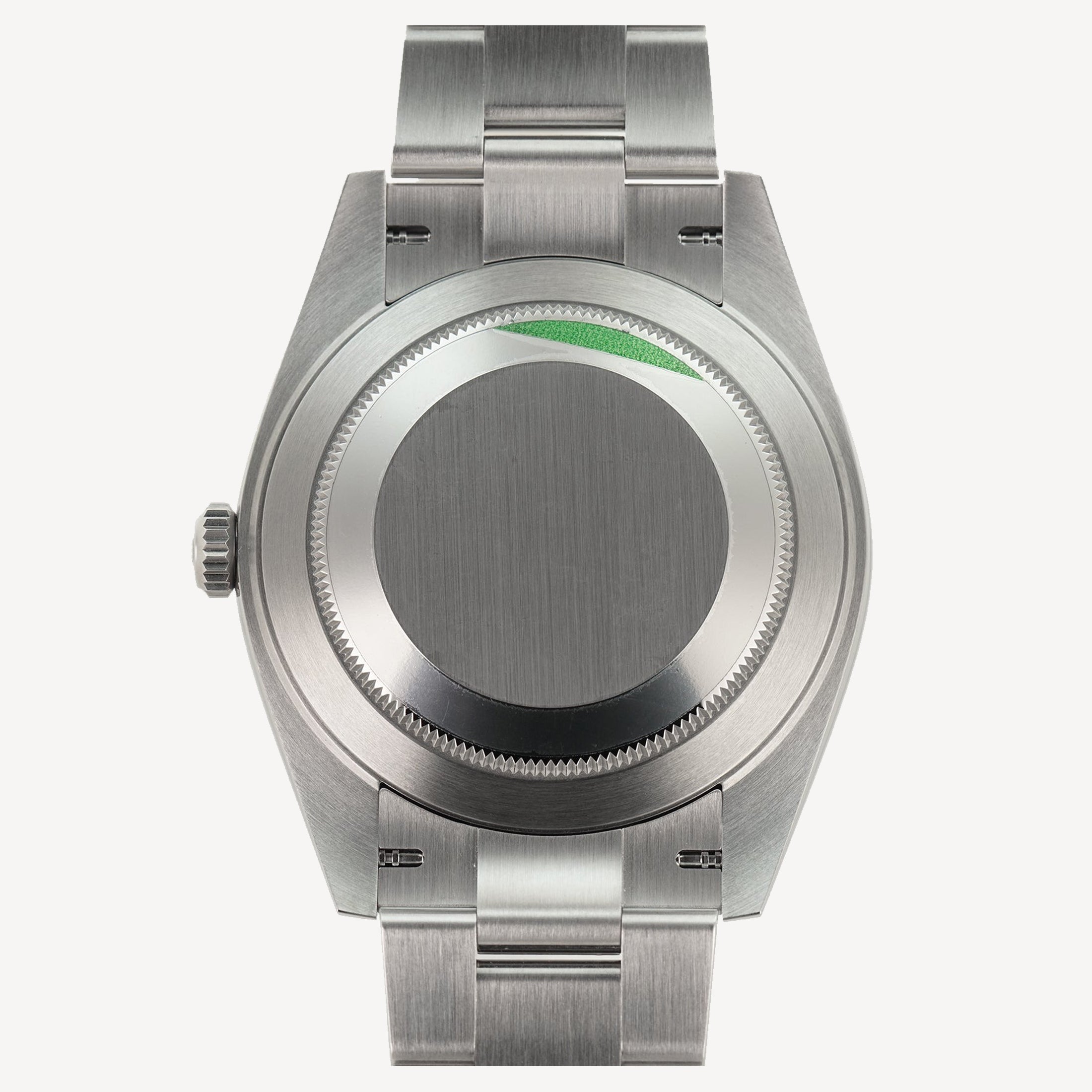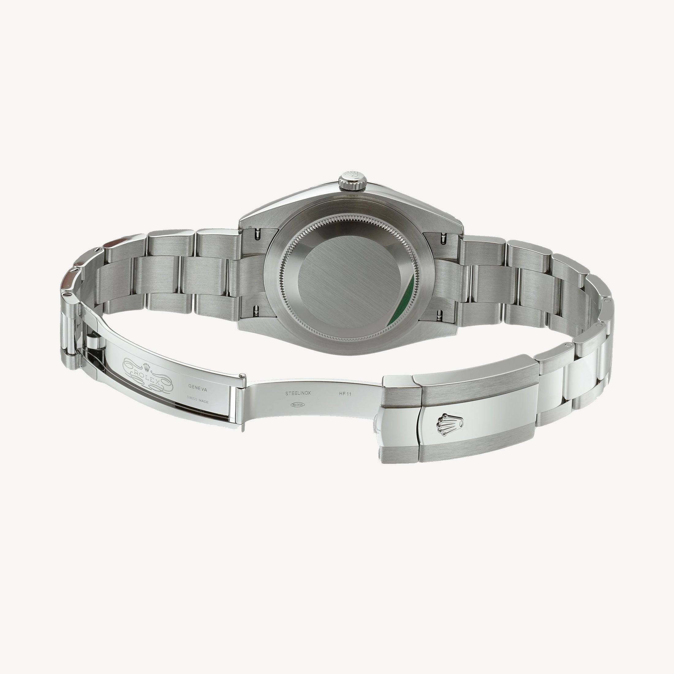 Case is made of high-polish finished stainless steel with the exception of the case back which is combination of satin-finished and high-polish stainless steel. Mounted atop is a fluted 18k white gold bezel. The oyster bracelet is of the same material, with high-polish finished center links and brush-finished outer links.