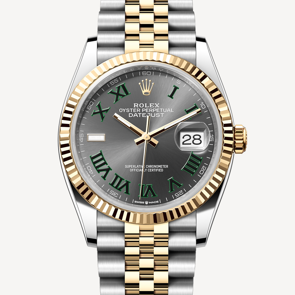 This Oyster Perpetual Datejust 36 in Oystersteel and yellow gold features a slate dial and a Jubilee bracelet.