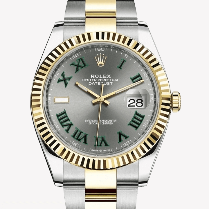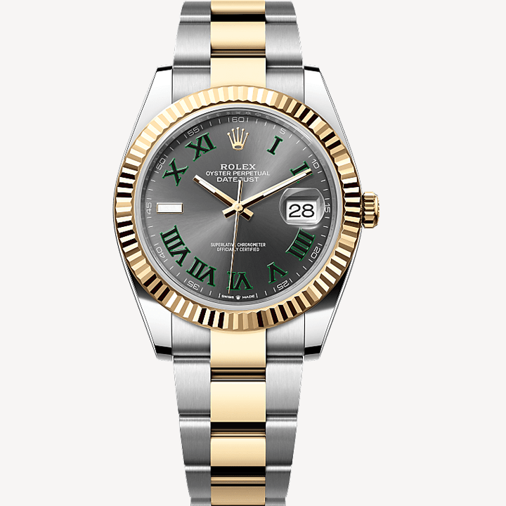 This Oyster Perpetual Datejust 41 in Oystersteel and yellow gold features a slate dial and an Oyster bracelet.