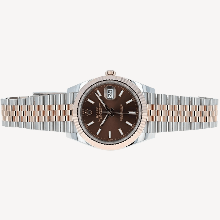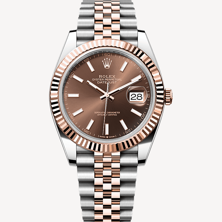 41mm Everose Rolesor case with 904L , screw-down steel back, 18K Everose gold screw-down crown, 18K Everose gold fluted bezel, scratch-resistant double anti-reflective sapphire crystal with cyclops lens over the date, Rolex calibre 3235 perpetual self-winding movement with date at 3 o'clock that changes instantaneously at midnight in a few thousandths of a second, approximately 70 hours of power reserve, Everose Rolesor Jubilee bracelet made from a combination of 904L steel and 18K Everose gold. Waterproof to 100 meters.