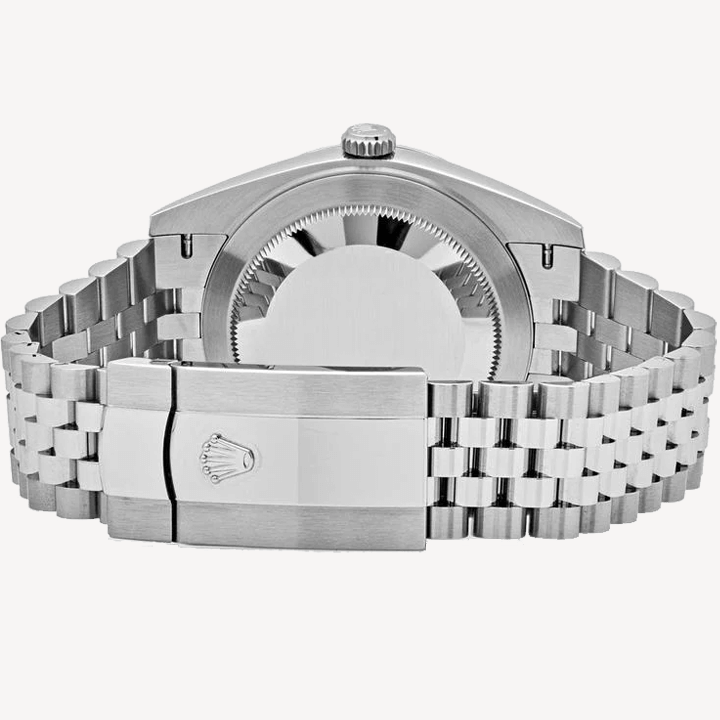 Sleek and stylish, it features a 41mm case, bezel, and bracelet made from shimmering stainless steel. The dark gray dial makes a statement thanks to design elements like luminous silver toned hands, contrast Roman numeral hour markers, and a date dial located at the 3-o-clock position. Powered by an automatic Rolex calibre 3235 movement, it possesses a 70 hour power reserve and a 100 meter water resistance.