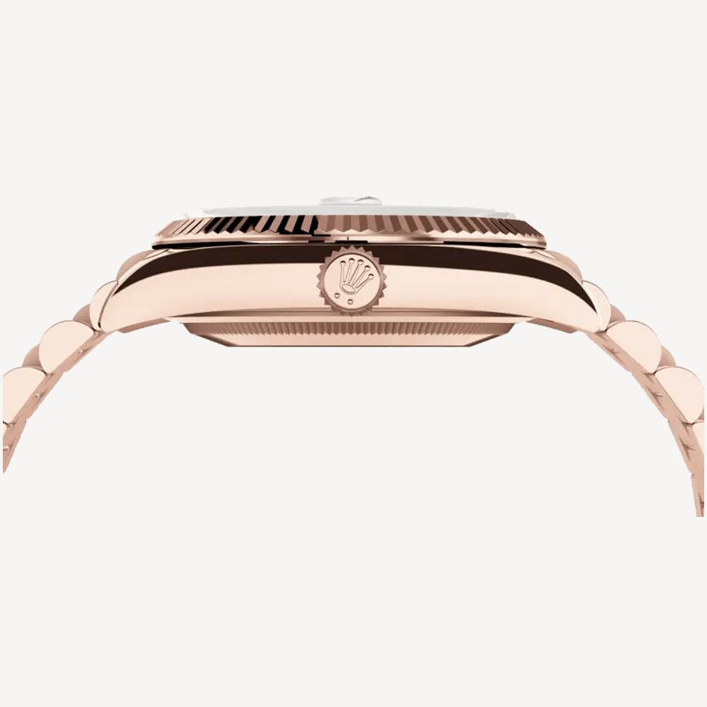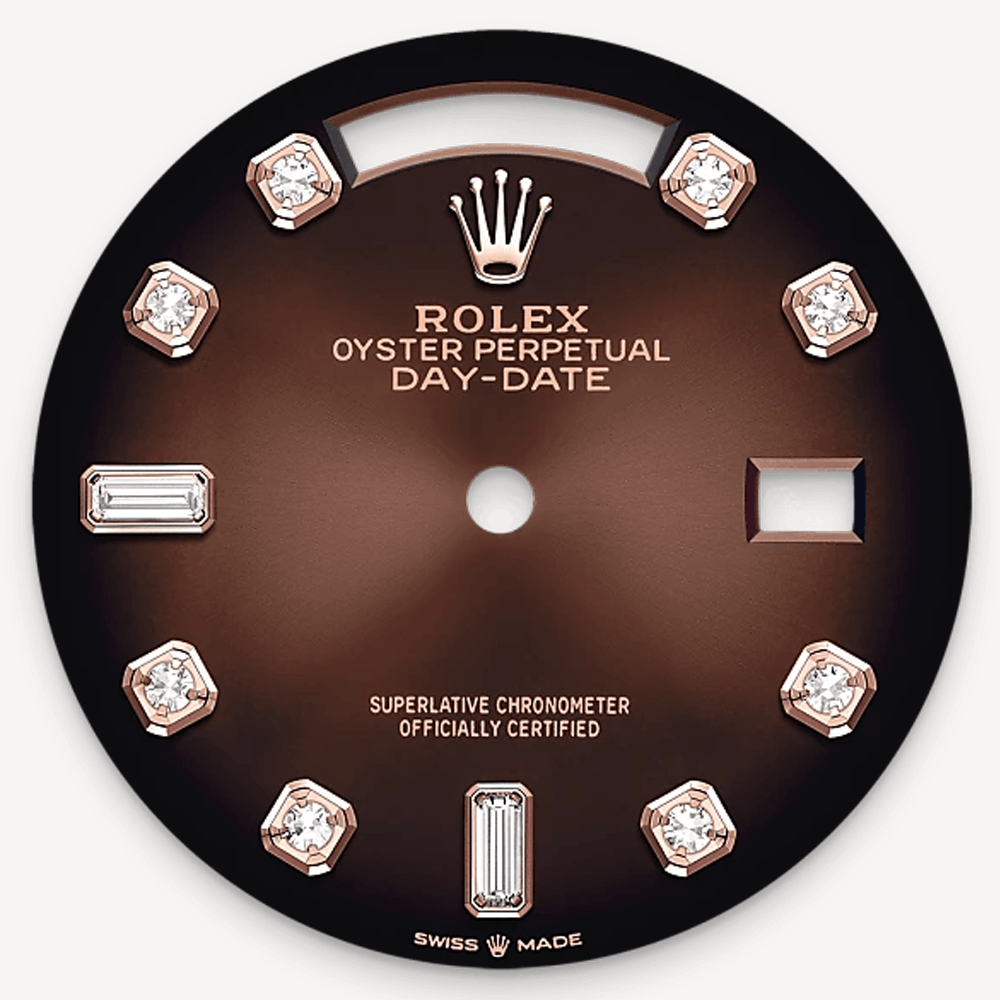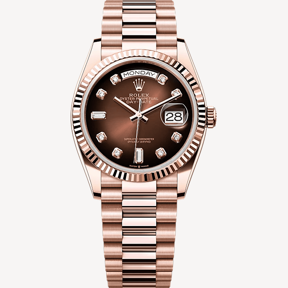 The Oyster Perpetual Day-Date 36 in 18 ct Everose gold with a brown ombré dial, fluted bezel and a President bracelet.