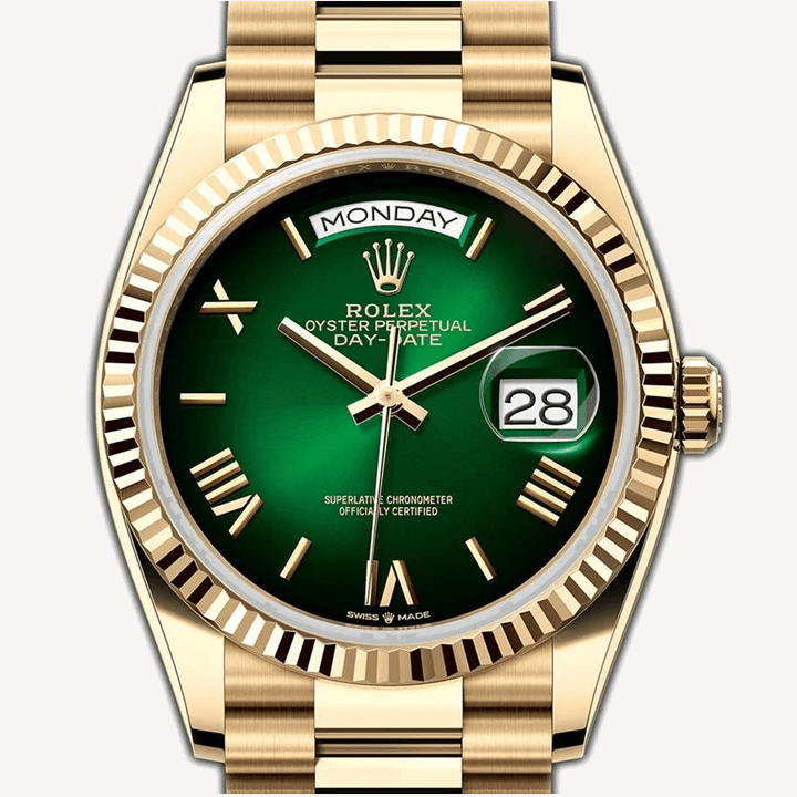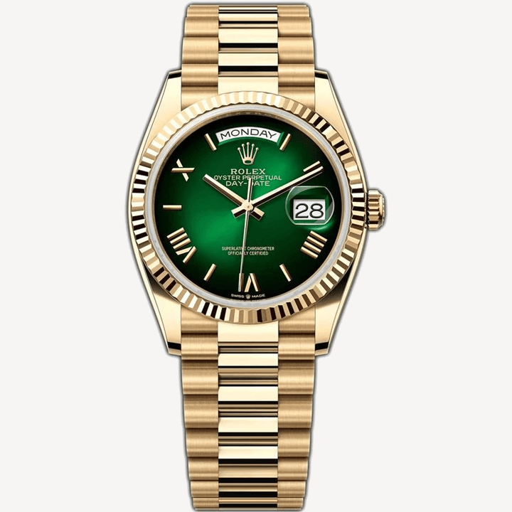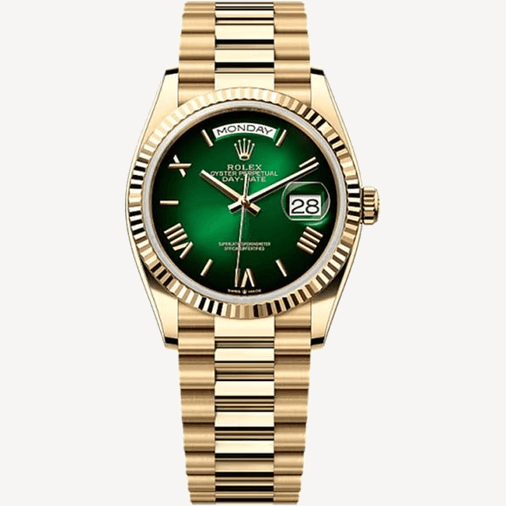 This luxurious timepiece features a 36mm 18K yellow gold case paired with a Green ombré dial. The dial is adorned with roman hour markers and the signature day and date windows, showcasing Rolex's attention to detail and craftsmanship. Powered by the Rolex Caliber 3255, this watch offers a 70-hour power reserve and is water-resistant up to 100 meters.