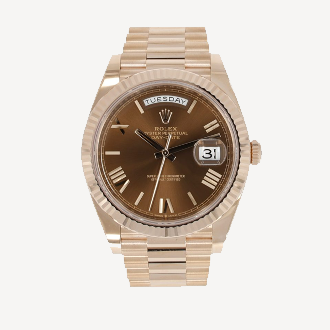 The Oyster Perpetual Day-Date 40 in 18 ct Everose gold with chocolate dial, fluted bezel and a President bracelet.