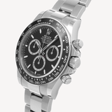 Rolex Cosmograph Daytona Oyster Steel 40 mm with Black Dial & Highly legible Chromalight display with long-lasting blue luminescence and black monobloc Cerachrom bezel in ceramic with engraved tachymetric scale. The Winding crown is screw-down, Triplock triple waterproofness system. The crystal is Scratch-resistant sapphire.