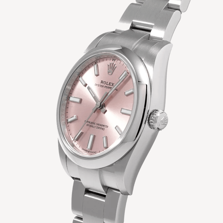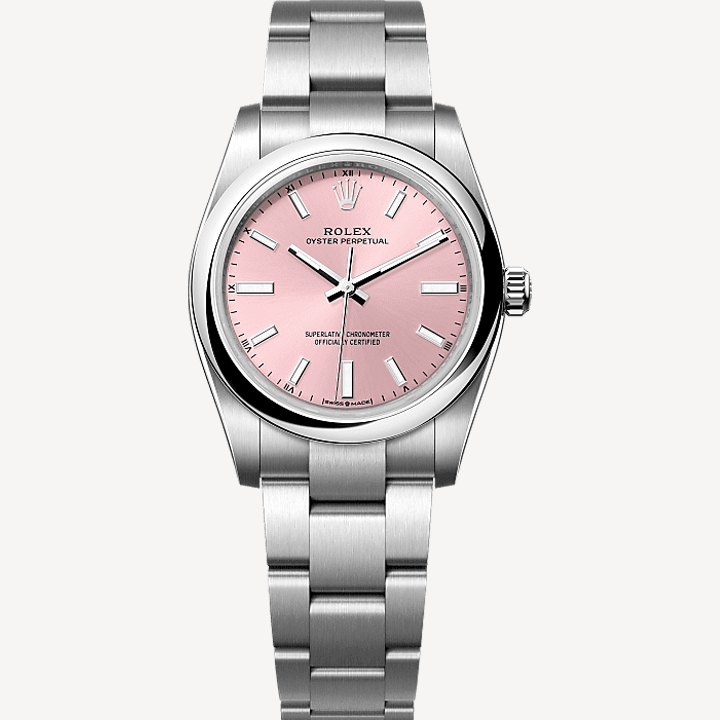 The Oyster Perpetual 34 with a pink dial and an Oyster bracelet.